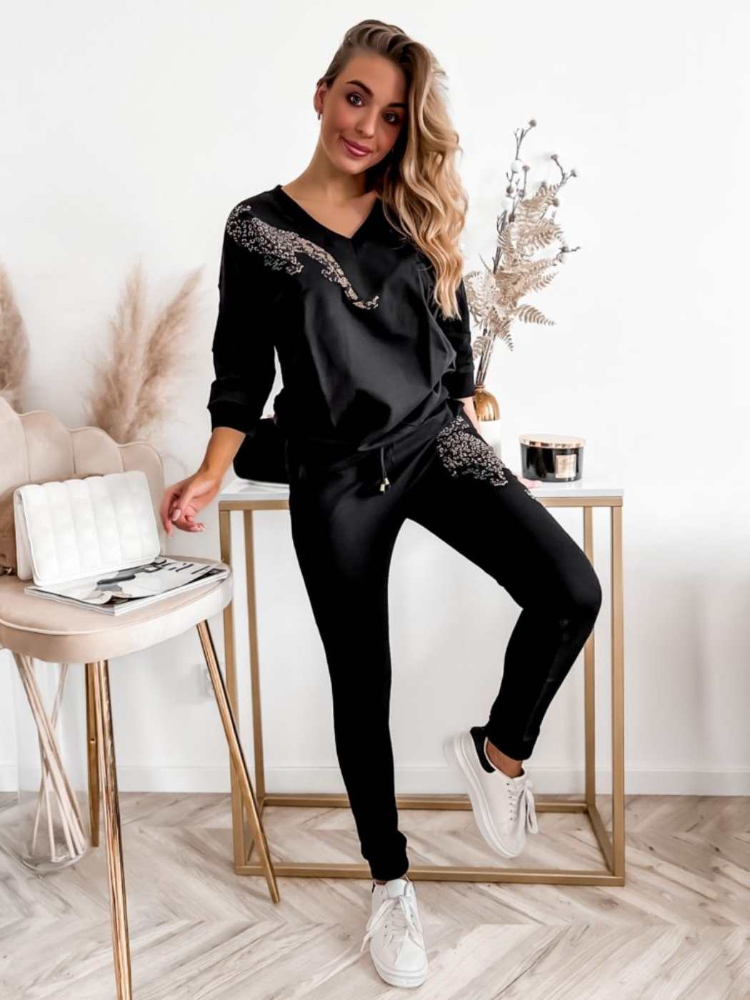 Komplet dresowy Pantera to wygodny zestaw, który łączy sportowy luz z kobiecym detalem. Miękka, grubsza bawełna dobrze układa się na sylwetce, a aplikacja w stylu pantery nadaje całości charakteru.